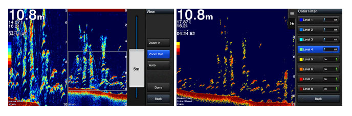 Shift Zoom feature lets you control your owned display portion to focus on detailed sonar data you need. Color Rejection feature lets you concentrate on simpler colors display on sonar page.