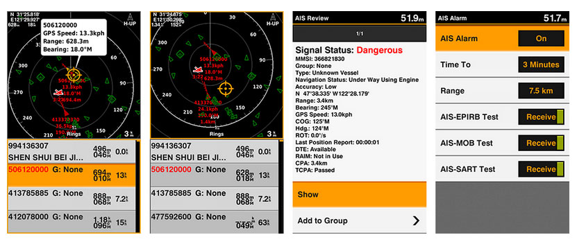 Show you the detailed AIS Radar view and AIS list at the same page. Move the cursor and review particular item on the radar view to see the detail information of highlighted vessel. Drop VRM/EBL and measure distance on the AIS Radar view window and to focus a AIS vessel through the AIS list to see the detail of it.