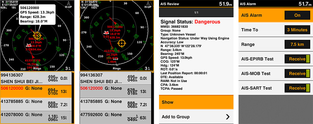Show you the detailed AIS Radar view and AIS list at the same page. Move the cursor and review particular item on the radar view to see the detail information of highlighted vessel. Drop VRM/EBL and measure distance on the AIS Radar view window and to focus a AIS vessel through the AIS list to see the detail of it.